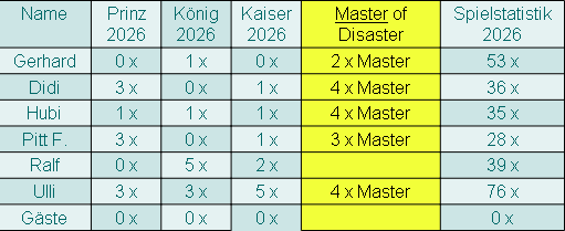 Hexenschuss wurde verzichtet. Das heisst für das Ergebnis; Ulli 9 verlorene Spiele,